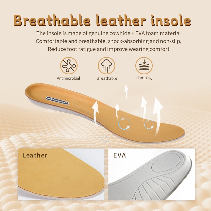 Стелка от естествена телешка кожа + EVA пяна — дишаща, абсорбираща ударите и не се плъзга. Поддържа краката свежи миля след миля.