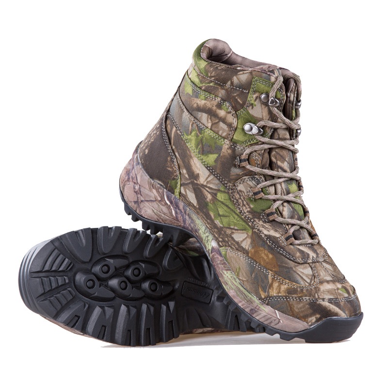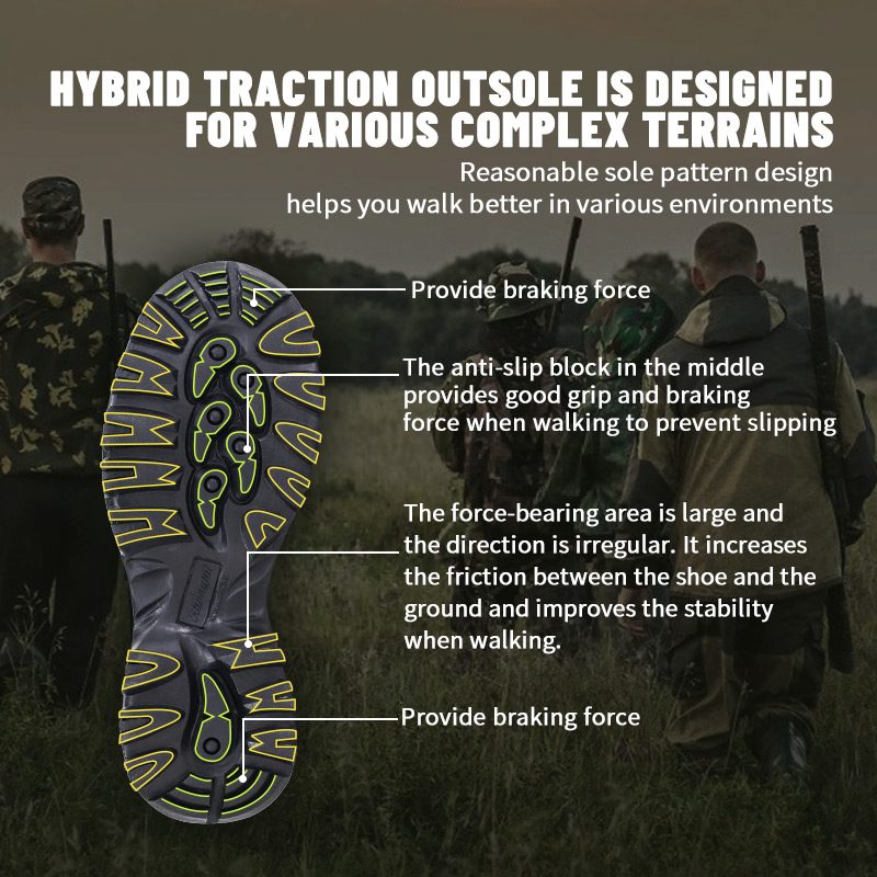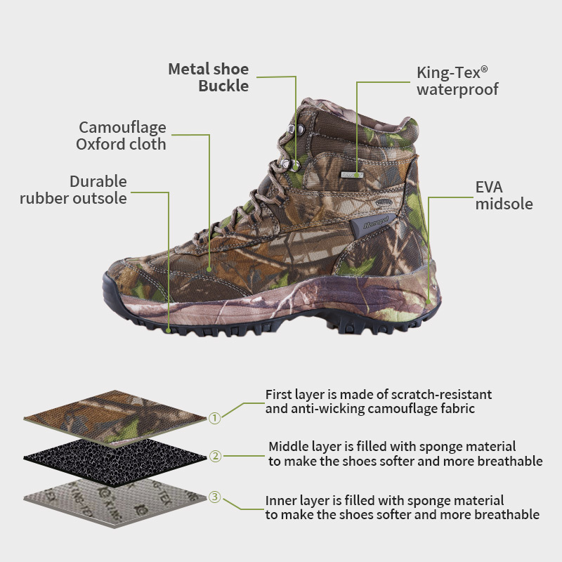 ①Poliyou силно разтеглива влагоотвеждаща стелка поддържа вътрешността суха. ②Междинна подметка EVA, обвита в камуфлажен плат, омекотяване и абсорбиране на удари. ③Издръжлива гумена подметка, неплъзгаща се и устойчива на износване.