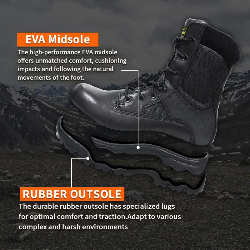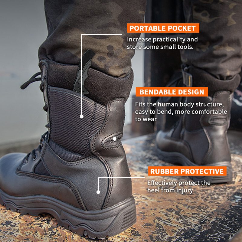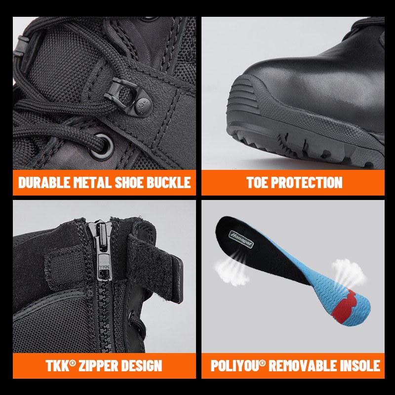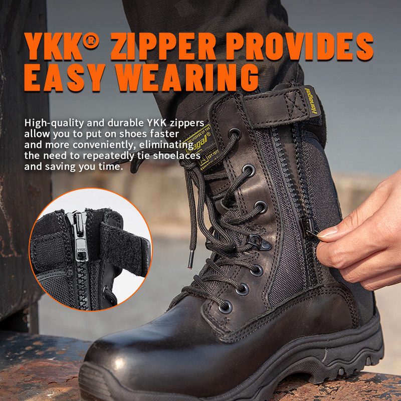 Тези YKK полицейски ботуши от пълнозърнеста кожа с цип са налични за персонализиране на цветове, материали и детайли, с MOQ от 800 чифта, идеални за сътрудничество с марка и групови доставки. И тези ловни ботуши имат следните предимства: